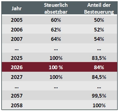 Damit liegt der abzugsfähige Prozentsatz bei 100 %. Beginnt im Jahr 2031 die Rentenauszahlung, so liegt der steuerpflichtige Anteil der Rente hingegen nur bei 86,5 %. Damit ergibt sich ein „Steuerplus“ von +13,5 %.