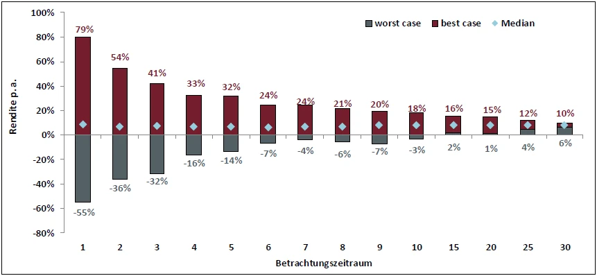Zum Zweiten kann bei der Basisrente auf die Bruttobeitragsgarantie verzichtet werden. Dies erhöht die Chancen auf eine höhere Rendite noch einmal deutlich. Das Verlustrisiko sinkt dabei mit längerem Anlagehorizont erheblich, wie folgendes Schaubild verdeutlicht. Damit kann bei mittleren und langen Laufzeiten auf eine Beitragsgarantie zu Gunsten höherer Renditechancen durchaus auch vollständig verzichtet werden. Die Abbildung zeigt, dass beim DAX in bisher keinem 15 Jahreszeitraum eine negative Rendite erzielt worden wäre. In allen 25 Jahreszeiträumen wäre sogar mindestens eine Rendite von 4 % p.a. erzielt worden.