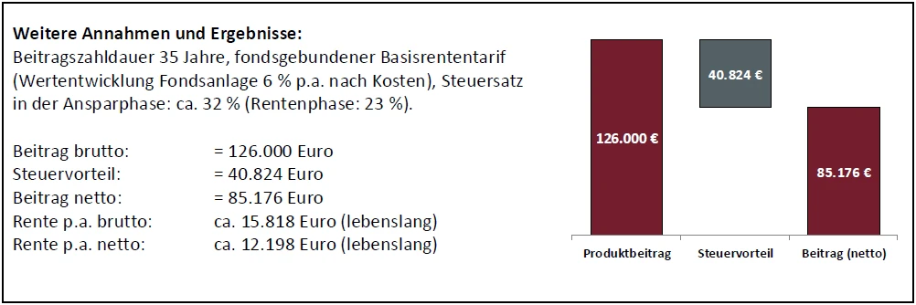 Spart etwa eine 32-jährige Frau (verheiratet) mit einem gemeinsamen zu versteuernden Einkommen von 76.400 Euro regelmäßig 300 Euro monatlich bis zum Rentenbeginn in einer fondsgebundenen Basisrente an, so kann er mit einer Rendite von ca. 4,4 % nach Förderung, Kosten und Besteuerung rechnen. Ein alternatives Investmentprodukt müsste 6,1 % p.a. vor Abgeltungsteuer erzielen, um die gleiche Rendite nach Abzug der Abgeltungsteuer zu erwirtschaften.