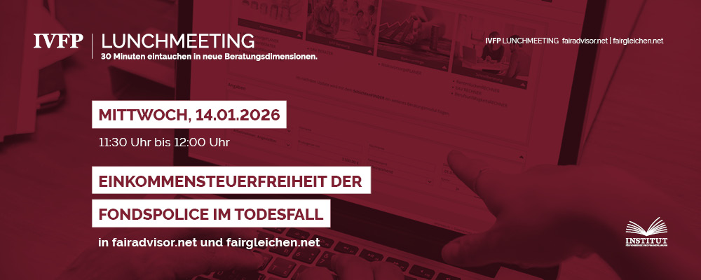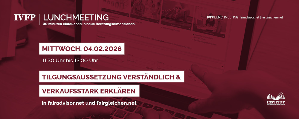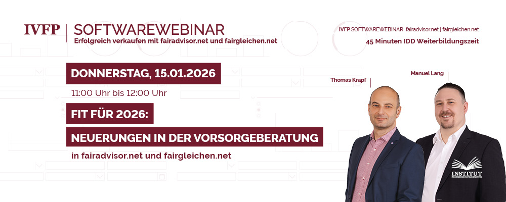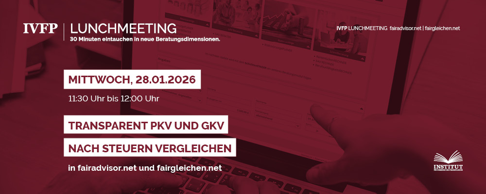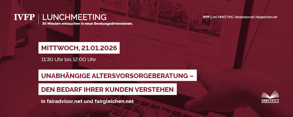 Tauchen Sie mit dem digitalen IVFP.Lunchmeeting und digitalen IVFP.Softwarewebinar in die neuen IVFP Beratungsdimensionen von fairadvisor.net und fairgleichen.net ein. IVFP Experten zeigen Ihnen in regelmäßigen, kostenlosen Webinaren, wie Sie Ihre Beratung zur Altersvorsorge optimieren können. Die Beratungssoftware fairadvisor.net und Tarifvergleichssoftware fairgleichen.net bieten Ihnen die Möglichkeit, eine auf die Bedürfnisses Ihrer Kund:innen abgestimmte Altersvorsorge zu finden. Gewinnen Sie jetzt einen Einblick mit unseren Online-Events.