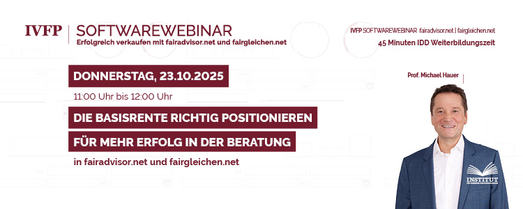 Tauchen Sie mit dem digitalen IVFP.Lunchmeeting und digitalen IVFP.Softwarewebinar in die neuen IVFP Beratungsdimensionen von fairadvisor.net und fairgleichen.net ein. IVFP Experten zeigen Ihnen in regelmäßigen, kostenlosen Webinaren, wie Sie Ihre Beratung zur Altersvorsorge optimieren können. Die Beratungssoftware fairadvisor.net und Tarifvergleichssoftware fairgleichen.net bieten Ihnen die Möglichkeit, eine auf die Bedürfnisses Ihrer Kund:innen abgestimmte Altersvorsorge zu finden. Gewinnen Sie jetzt einen Einblick mit unseren Online-Events.